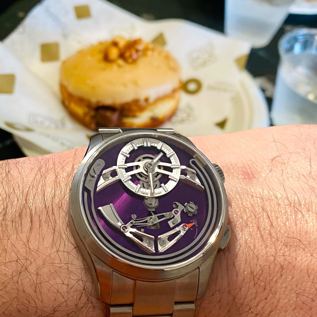 The Candied Hazelnut & Nutella doughnut and the Bel Canto Viola Purple share a devotion to sensory pleasure and thoughtful craftsmanship. Each element, whether flavor or mechanical note, is tuned for balance. The salted caramel glaze resonates with the Bel Canto’s restrained elegance, never overpowering, always refined. The Nutella’s velvety richness parallels the movement’s mechanical depth, while the crunch of candied hazelnuts reflects the watch’s clear, resonant chime. Together, they create a duet of indulgence and precision.