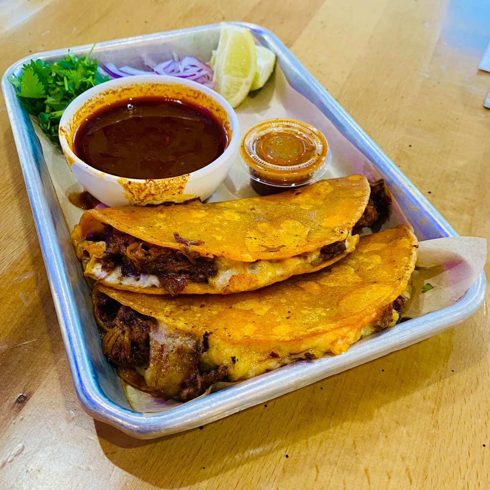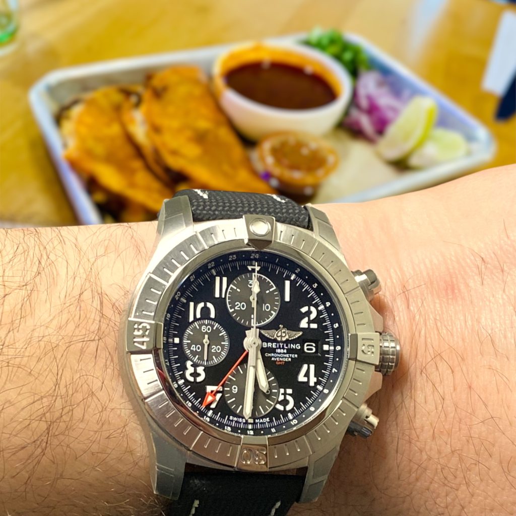 Next comes the birria queso tacos, filled with braised beef and melted cheese, served alongside a rich consommé for dipping. The tortillas are crisped on the griddle, holding up beautifully to the intensity of the filling. This dish mirrors the Avenger’s bold 45 mm case size and rugged construction, built to withstand pressure while delivering depth and richness. Just as the birria gains complexity from slow braising, the Breitling shows its mastery through carefully engineered performance over time.