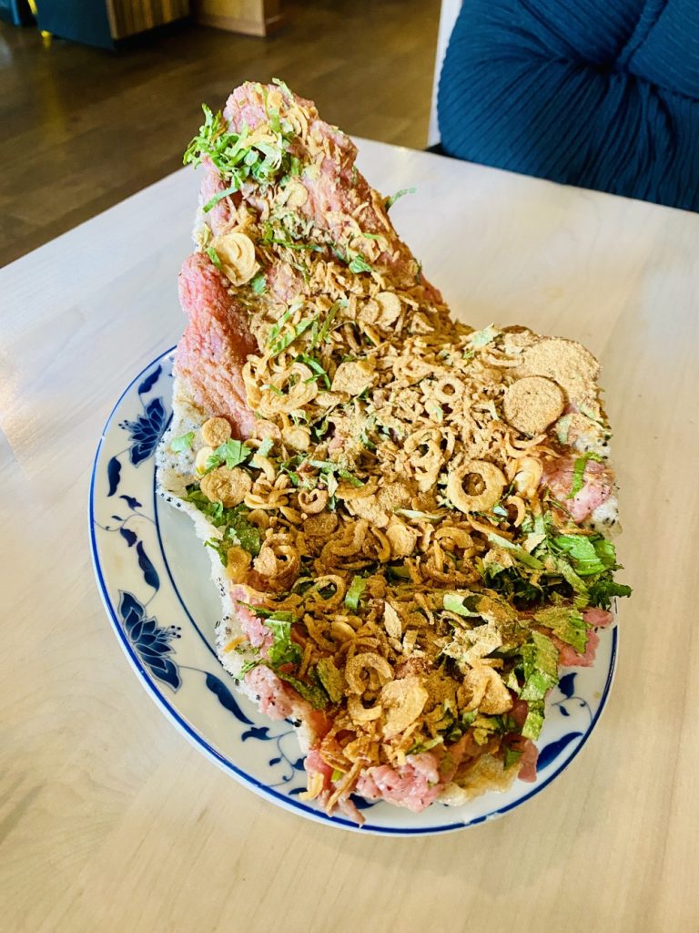 The Vietnamese Beef Carpaccio presents lime cured slices of beef layered under a vibrant mound of herbs and crispy shallots, all sitting atop a crispy sesame rice cracker. Its lively acidity and aromatic freshness immediately brighten the palate. It is a MUST HAVE! This energetic character calls to mind the high frequency of the El Primero caliber, which beats at 36,000 vibrations per hour. The dish and the watch share a spirited pulse that is fast, precise, and exhilarating.
