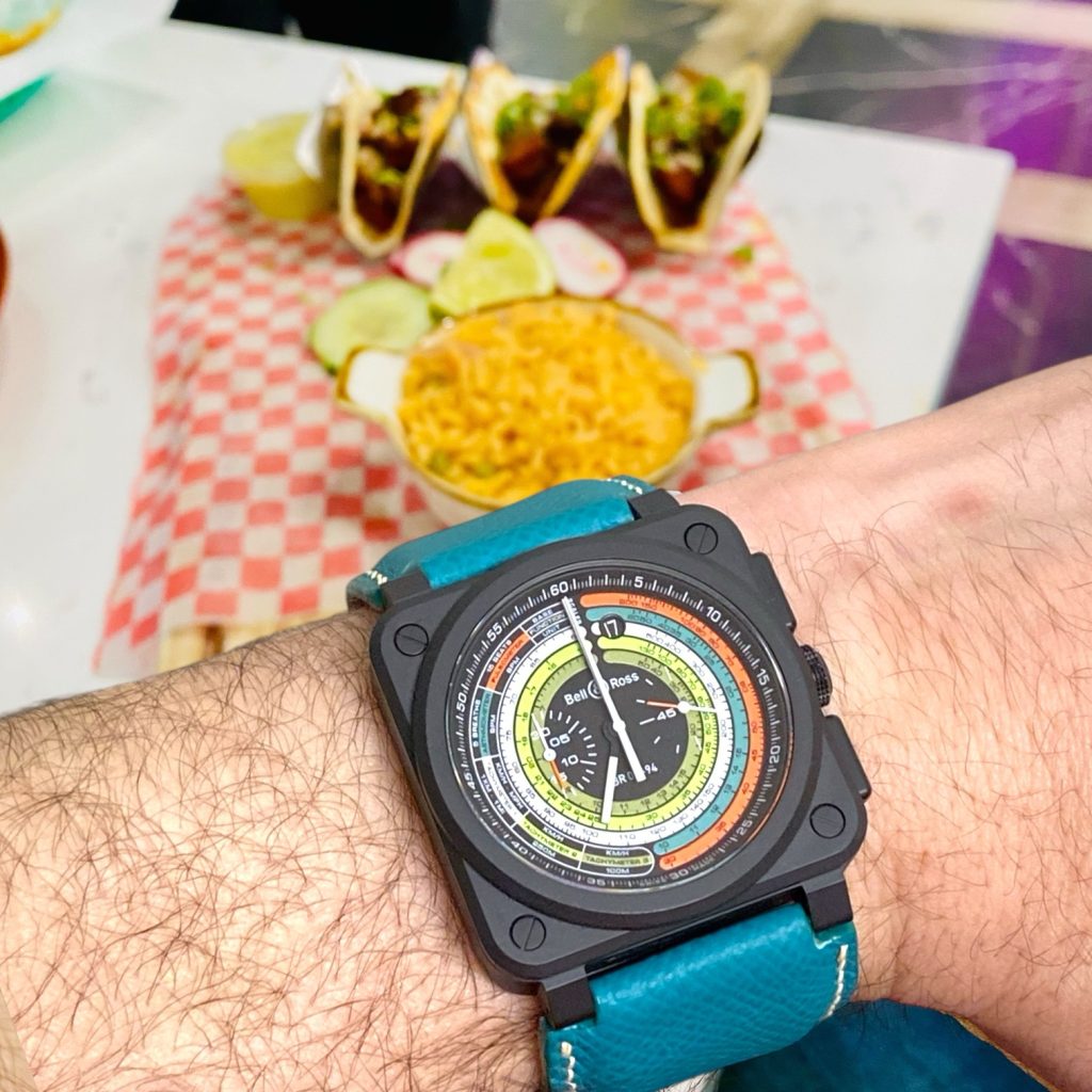 The Mini Trompitos feature skewers of pastor layered with pineapple, accompanied by rice, fresh garden salad, and avocado slices. The caramelized edges of the meat meet the sweet tang of pineapple, resulting in a combination that is both powerful and refreshing. This play of contrast resonates with the design of the BR 03-94 Chronograph Multimeter. Its bold black ceramic case emphasizes durability and strength, while the vibrant pops of color on its dial bring energy and modern flair. Like the sweet acidity of pineapple that brightens the rich pastor, the dial’s multi-colored scales add dimension to the watch, turning a precision instrument into a statement of style.
