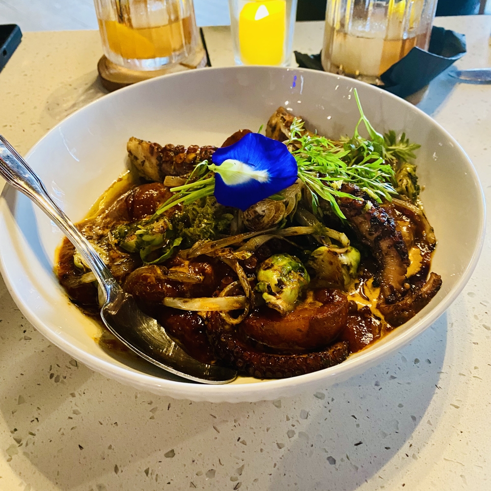 The evening begins with the Grilled Octopus served with Togarashi Potatoes and Brussels Sprouts. Tender octopus, charred to perfection, intertwines with the gentle spice of togarashi and the earthy bite of Brussels sprouts. Much like the octopus reveals layers of flavor, the Zenith Chronomaster reveals layers of engineering through its open sapphire dial. Each bite and each glimpse into the movement speaks of depth, detail, and mastery.